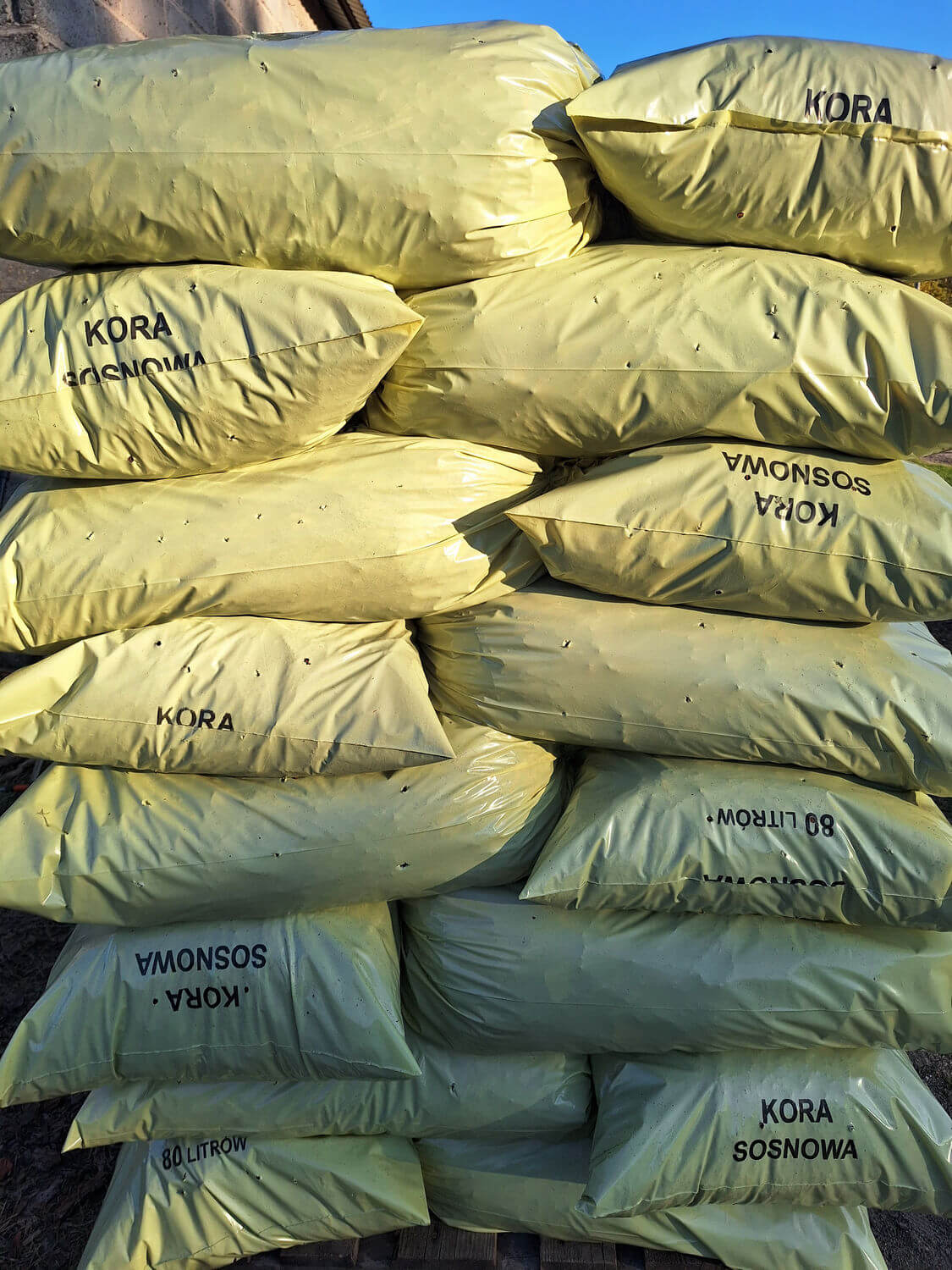 Kora sosnowa jest idealna do ściółkowania iglaków, azalii, różaneczników, wrzosów oraz innych roślinek kwasolubnych. Może być także wykorzystana jako ściółka pod krzewy czy byliny, które tolerują podłoże o lekko kwaśnym odczynie. Kora jest w workach 80litrowych. Możliwy transport.
